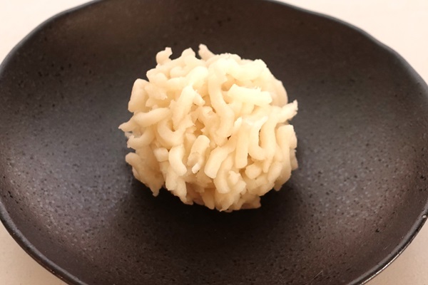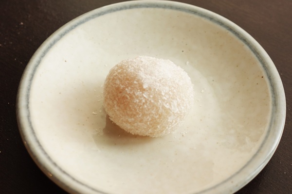 もう1つは道明寺の雪餅(ゆずあん入り)。桜餅と同じ道明寺粉で餅を作り、中にゆずあんを包み、氷餅をまぶして仕上げます