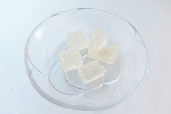 寒天を固め、途中で結晶化させたものを固めたもの。サクッとした食感が特徴です
